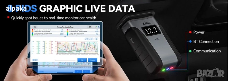 Пълни системни данни в реално време с един поглед: За разлика от ограничените четеци на кодове, A30D осигурява достъп в реално време до всички основни системи на превозното средство. Показания в реално време, като температура на маслото, налягане на спирачките и състояние на предавката, се показват в ясни графики за бърз анализ. Този диагностичен инструмент за OBD II скенер улеснява откриването на аномалии. Независимо дали сканирате у дома или в сервиз, този скенер за автодиагностични кодове ви помага да вземате информирани решения с яснота и прецизност.