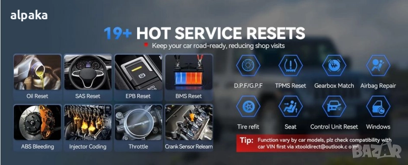 19 функции за нулиране за рутинна поддръжка: Скенерът за неизправности на автомобил A30D предлага 19 често използвани функции за нулиране без допълнително заплащане: Запознаване с предавките (инструмент за повторно запознаване с датчика за колянов вал/разпределителен вал), обезвъздушаване на ABS, нулиране на маслото, кодиране на инжекторите, повторно запознаване с дроселовата клапа, нулиране на TPMS, нулиране на BMS, нулиране на EPB, нулиране на SAS, съвпадение на скоростната кутия, калибриране на седалките, ремонт на въздушните възглавници и др. Този автомобилен скенер поддържа превантивна поддръжка, като ви помага да удължите живота на автомобила и да намалите рисковете от ремонт. Функциите варират в зависимост от марката и годината на производство на автомобила, моля, проверете съвместимостта преди покупка.