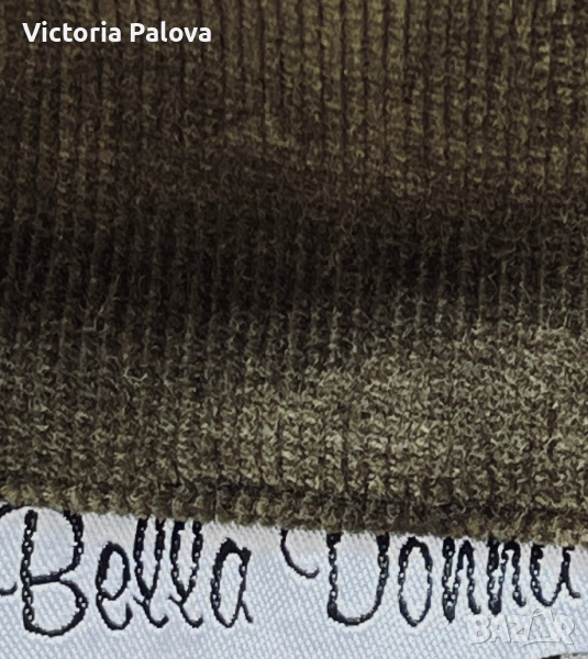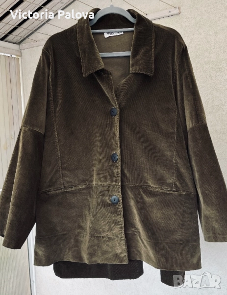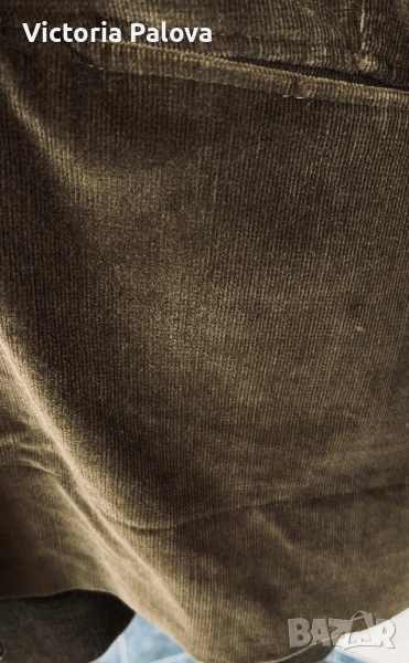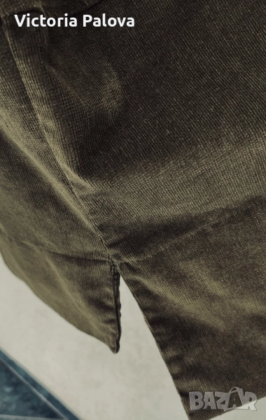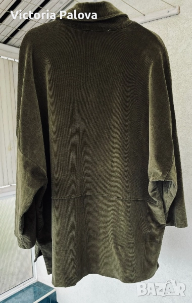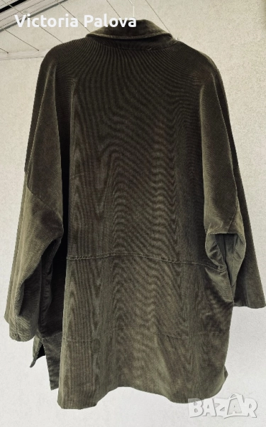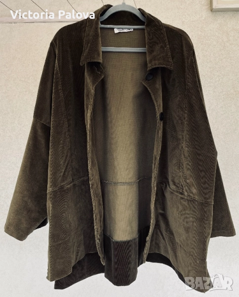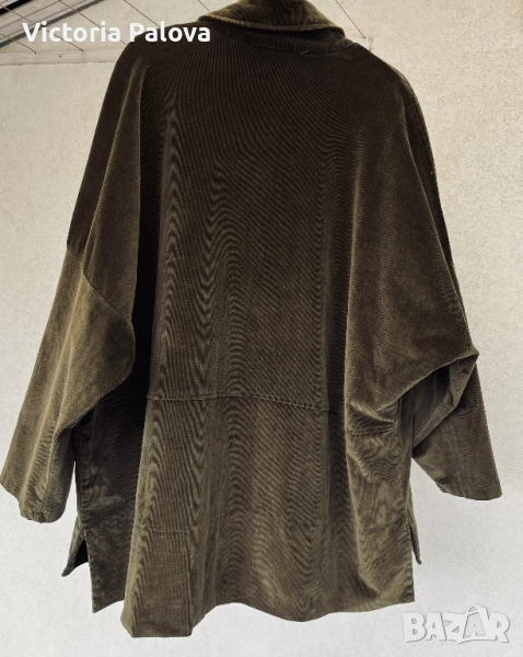 Неизползвано яке от меко рипсено кадифе с бохемски шик. Тъмнозеленикавият нюанс напомня на мъх или дъбова кора - земен тон, който е моден тази година и се вписва в тенденциите за естествени цветове. Подходящо е за хора, които обичат комфорт с шик, идеално е за есенен vibe. Дизайнът е защитен по закон. Рамо - 88см, ГО -79см, дължина отпред - 75см, отзад - 81см, ръкав -34см, странични цепки.