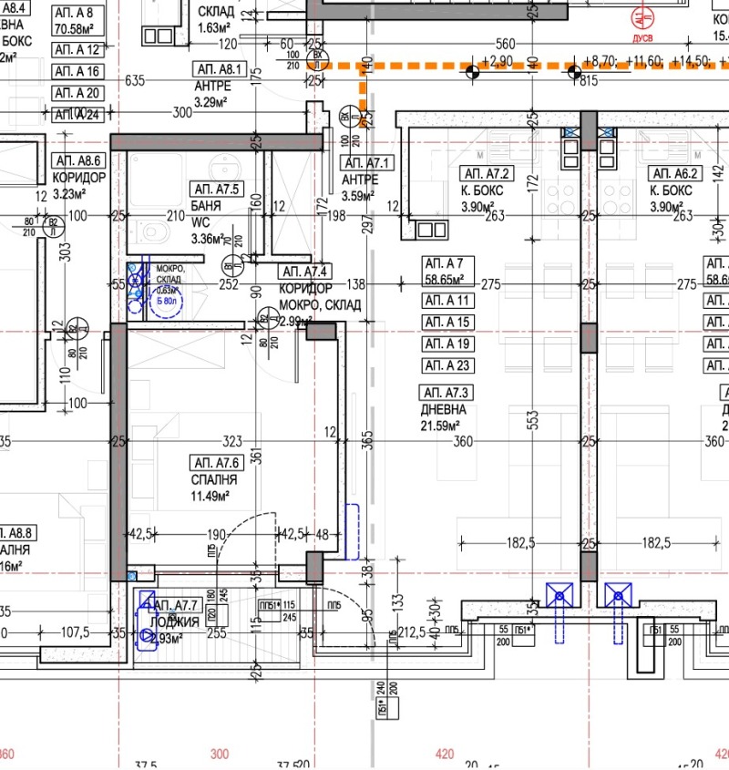 АПАРТАМЕНТЪТ е без забележка! Намира се на среден (4/8) етаж, вътрешен и напълно покрит. Изложението е изцяло южно, което гарантира огромно количество светлина и ниски режийни разходи! Всички помещения са с правилни форми. Предвидено е място за порт манто в коридора и мокро помещение до банята. На терасата се излиза от двете помещения (виж скицата). Отоплението е на газ, предвидени са изводи за климатици.