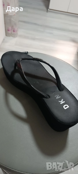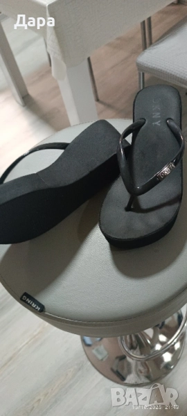 Дамски чехли на платформа, черен цвят. Много меки и удобни. Размер на стелката -26.Височина на тока - 6см Отговарят на размер 39. В отлично състояние.