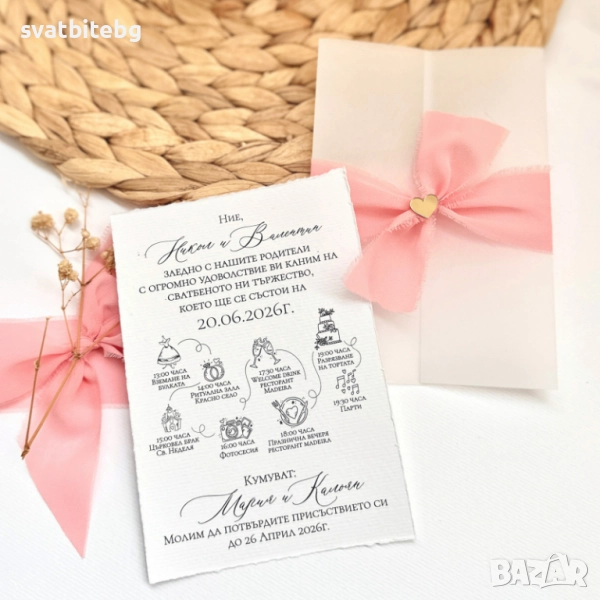 Всяка покана може да бъде персонализирана по ваш избор – различни цветове и текст според темата на вашето събитие. Ние ще създадем покани, които ще впечатлят вашите гости и ще превърнат сватбата ви в незабравимо изживяване.