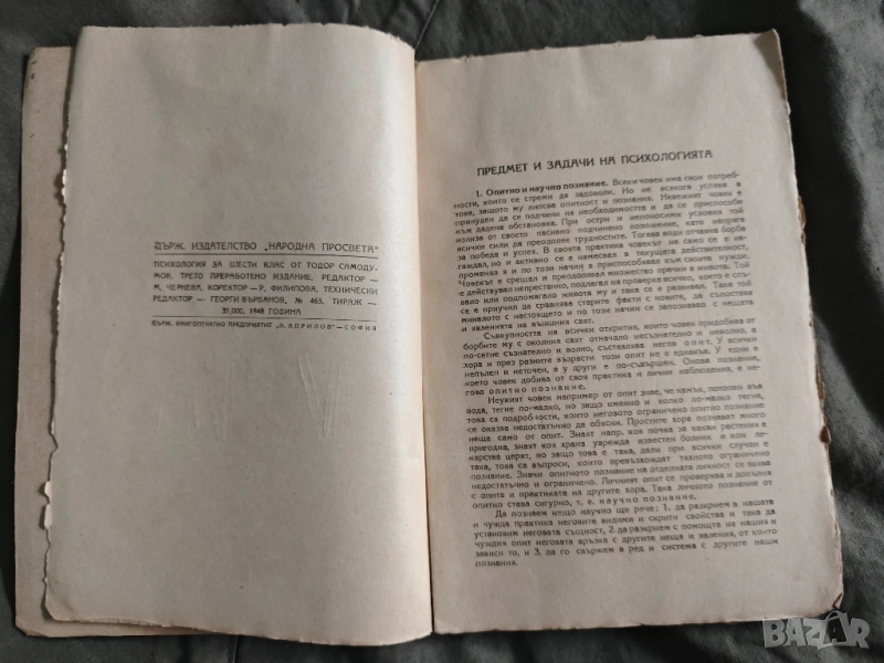 Продавам учебник " Психология за шести клас " Тодор Самодумов 1948 г. 132 стр. Почти цялата е с неразгадани страници. Много драсканици с молив предимно по кориците