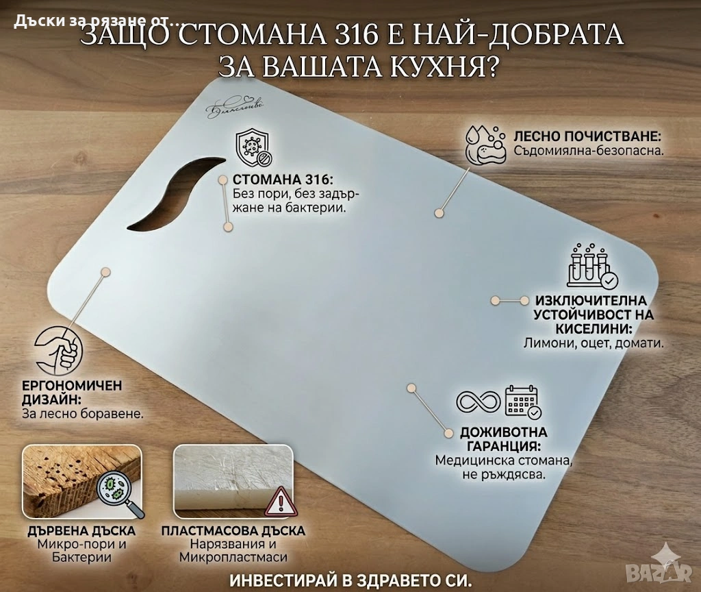 Елегантна и стилна дъска за рязане от неръждаема стомана 316. Идеален подарък за всеки кухненски ентусиаст. Персонализирайте своята дъска с текст или изображение. Висококачествен продукт, подходящ за всекидневна употреба.