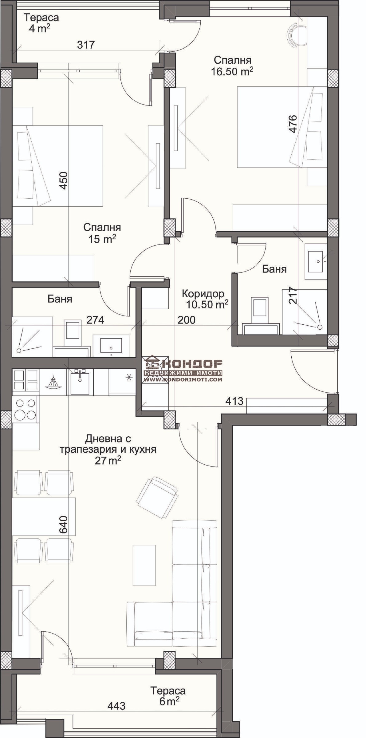 Оферта 65045: ГОТОВА СГРАДА!!! Предлагаме Ви възможността да закупите тристаен апартамент в луксозен жилищен комплекс с модерна визия, проектиран да създаде максимален комфорт на живущите в него. Основната концепция e премиум строителство, отличаващо се със съвременен архитектурен дизайн и европейска визия. Едно от основните му предимства е страхотната локация, разположен на пешеходна близост до Централна градска част, съчетаващо лукс спокойствие и комфорт. Жилището се състои от южна дневна с трапезария и кухненски бокс - 27 кв.м. имаща излаз на тераса, спалня 15 кв.м със собствено санитарно помещение, втора спалня - 16 кв.м, втора тераса - обща за двете спални, втора баня с тоалетна и просторен коридор. Към апартамента има прилежащо избено помещение, включено в цената. Основната концепция при проектирането е да се постигнат просторни и функционални стаи с цел да се създаде максимален уют на модерното семейство. Изключителна съвременна архитектура и модерна технология на строителство. Визията е иновативна, привличаща внимание с уникалността си. Безопасна и сигурна среда за пребиваващите допълват комфорта на сградата. Всяко жилище разполага с пълно окабеляване за домофон, интернет и кабелна телевизия, общите части са луксозно завършени, а апартаментите са с алуминиева дограма с троен стъклопакет от най-висок клас, както и масивна блиндирана входна врата. За удобство на живущите съществува възможността да закупят подземни и надземни паркоместа. Възможност за закупуване чрез Банков Кредит на изключително изгодни условия за клиенти на агенцията !!! ВИЖТЕ ОЩЕ ИЗГОДНИ ОФЕРТИ НА https://www.kondorimoti.com/ С ЕЖЕДНЕВНА АКТУАЛИЗАЦИЯ!