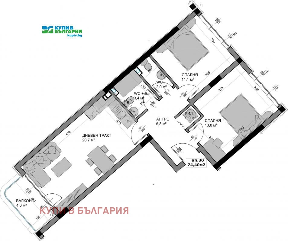 дневен тракт с кухненски бокс- 20.7 кв.м.,