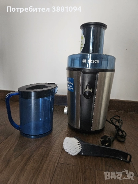 Много малко използвана сокоизстисквачка BOSCH. Пластмасови части без бисфенол А (BPA) за здравословна и безопасна подготовка. Улеснява изцеждането на сок от всички видове плодове и зеленчуци. Части, подходящи за миене в съдомиялна машина. Без повече капки сок върху работната ви повърхност. Висока добивност на сок Моторът се включва само когато сокоизстисквачката е правилно монтирана. Няма нужда от предварително нарязване на плодовете и зеленчуците. Размер, зареждаща тръба 73 mm Капацитет, съд за сок 1250 ml Капацитет, съд за пулп 2000 ml Дължина на захранващия кабел 100 cm Отделение за кабел Отделение за съхранение на кабел Нето тегло 4.5 kg Предпазно устройство Safety lock Микросито от неръждаема стомана за оптимално извличане на сок