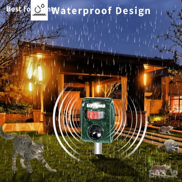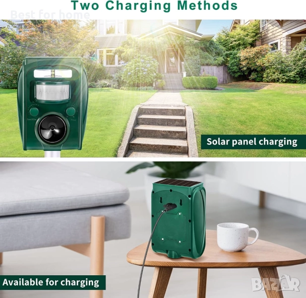 Водоустойчивият репелент за насекоми, активиран от PIR движение, осигурява хуманен начин за прогонване на нежелани животни. Няма отрови или капани. Той е безвреден за хората и околната среда и е много безопасен. Освен това е водоустойчив, не е нужно да се притеснявате, че няма да работи в дъждовни дни. В случай на продължително дъждовно време, трябва да го зареждате на закрито в продължение на 7 часа.