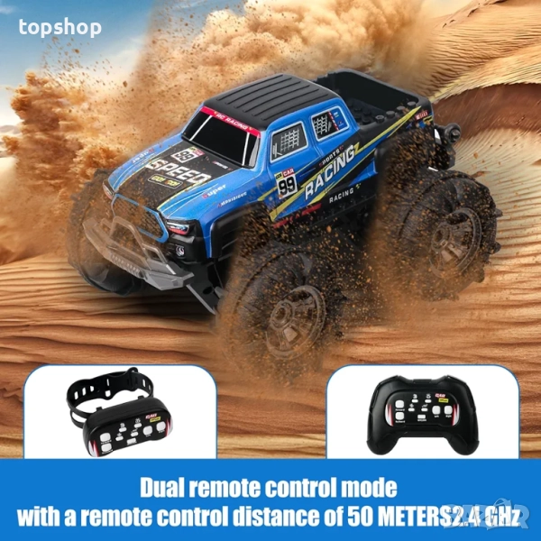 Водоустойчивите електронни компоненти превръщат този камион в превозно средство за всякакъв терен. Няма проблем да карате тези колички с дистанционно управление по пасища, пясък, неравни терени и река.