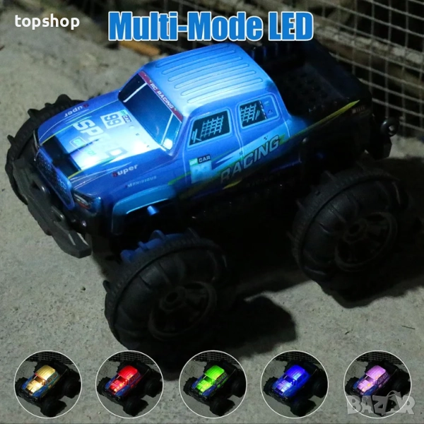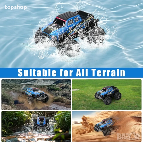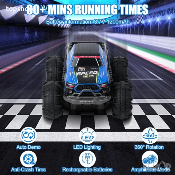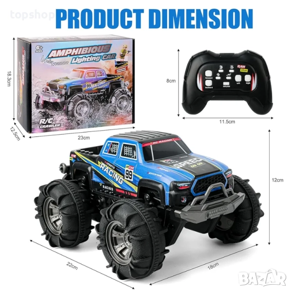 Амфибийна кола с дистанционно управление за деца, която не само е състезателна по суша, но и може да сърфира по водата. Оборудвана с водоустойчив гумен пръстен за защита на вътрешните аксесоари на колата, което прави възможно шофирането по вода.