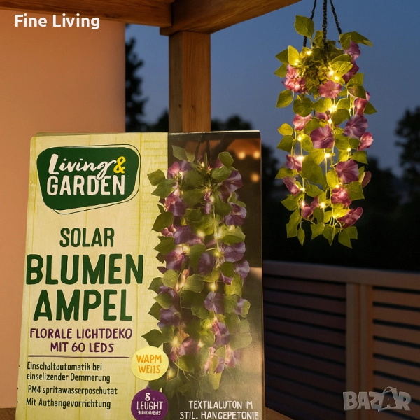 Добавете очарование и уют към вашата градина, тераса или балкон със соларната висяща саксия Living & Garden. Това е декоративно осветление с флорален дизайн и вградени 60 LED светлини, които създават мека и приятна топла бяла светлина. Напълно автономна и лесна за използване, тя се захранва от слънчева енергия и се включва автоматично при здрач.