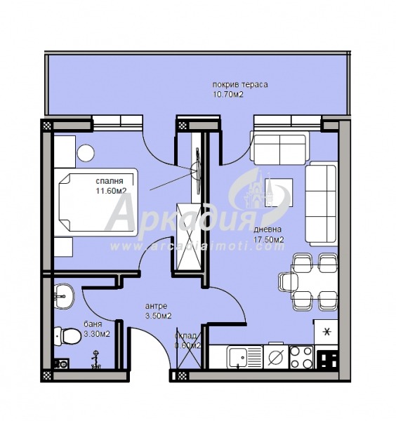 Разположението на стаите е следното - дневна с кухненски бокс, една спалня, входно антре,баня с тоалетна и една тераса. Жилището се предлага на шпакловка и замазка, входна блиндирана врата, ПВЦ-дограма от най-висок клас., монтирани ключове и контакти.