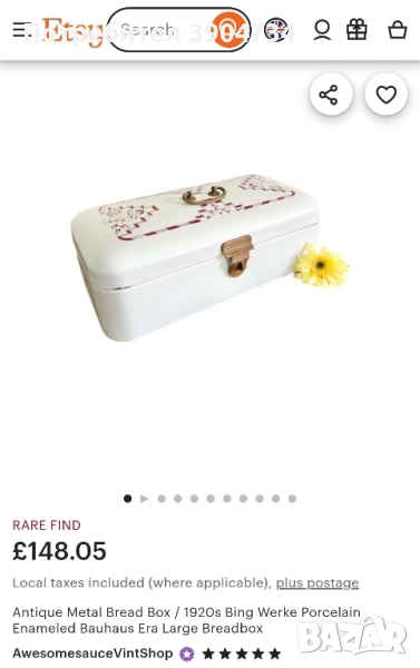 Рядка винтидж емайлирана кутия за хляб от 1920г.Произведена във фабриката Bing Werke,Germany-вижда се от маркировката.Изящна изработка въплъщаваща дизайнерското движение Баухаус.Перфектно състояние за над 100 годишна история.Панти,дръжка и закопчалка изработени от месинг-топ състояние,видно от снимките.Уникална изработка от старите майстори,вече няма такава.