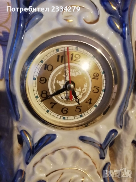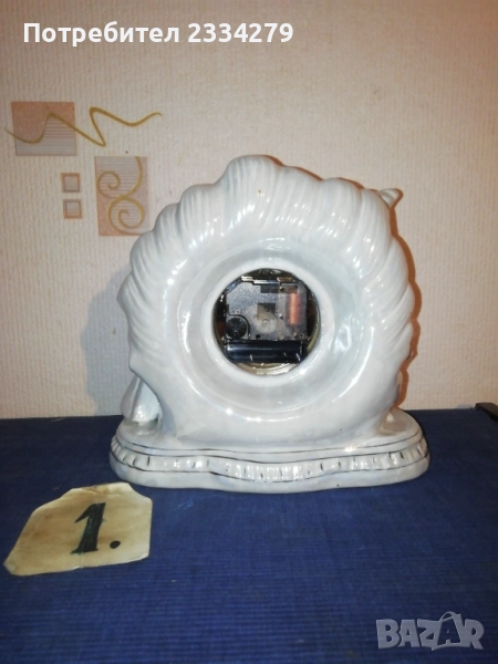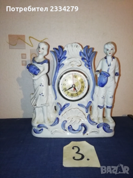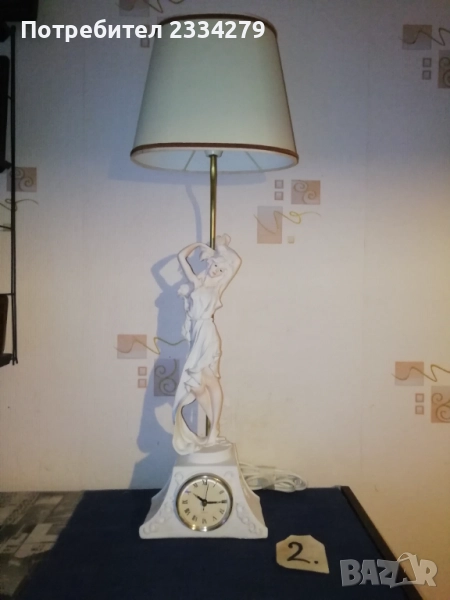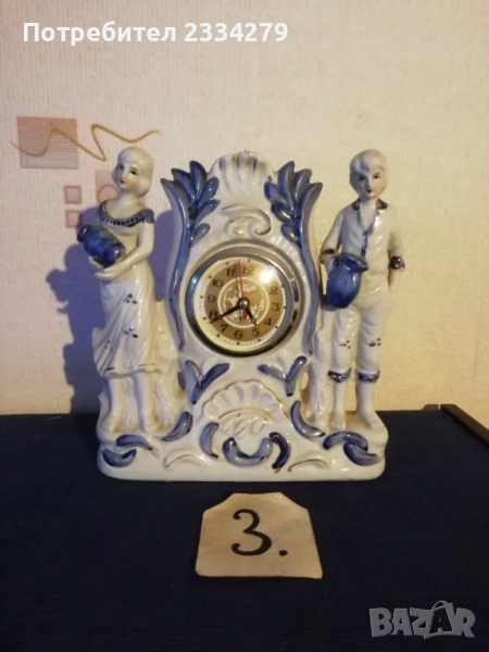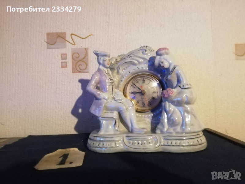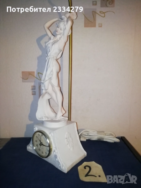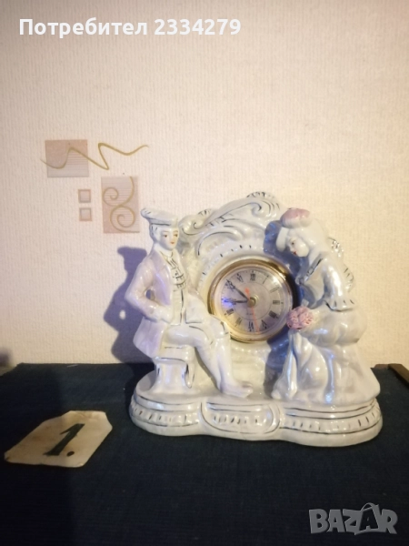 Стари настолни часовници. N:1стар порцеланов часовник в бароков стил, електромеханичен се размери , цена 35лв.; N:2 стар Английски часовник и нощна лампа ,,Ренесансова дама", масивна ръчна отливка от твърда смола-алабастър, размери 85х27см., цена 80лв.; N:3 порцеланов часовник статуя,, Ренесансова двойка", размери 23х25см., цена 30лв.; N:4 Ръчно изработена метална статуетка,,Велосипед с часовник" Германия, размери 28х20см., цена 17лв.; N:5 фаянсова статуетка часовник ,,слон" с размери 27х17см., цена 25лв.