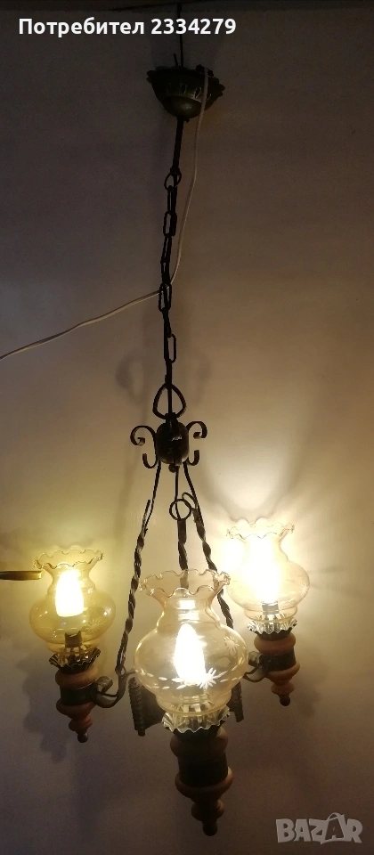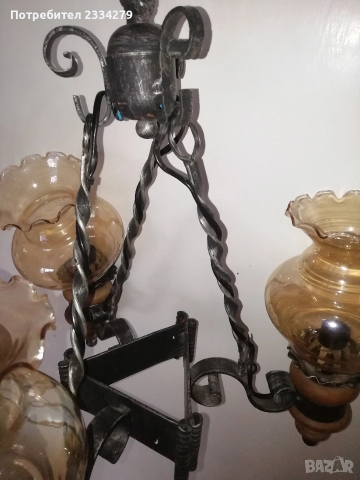 ковано желязо, дървени орнаменти стъкло, три тела, работещ в много добро състояние, цена 35€., подходящ за ползване и декорация на битова къща, вила, заведение, дом.; N:5 стара лампа за таван от 40-те, единична с виящ шнур метална фасунка и стъкло, размери 65х13см., цена 7€.