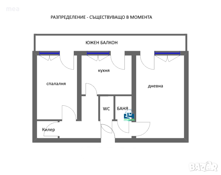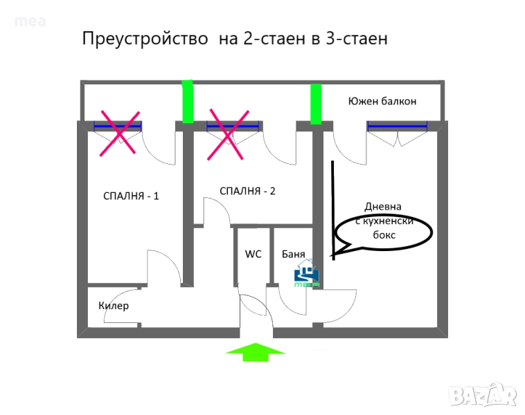 МЕА - недвижими имоти продава в ж. к. Лев Толостой, гр. София ЮЖЕН двустаен НЕПРЕХОДЕН апартамент с жилищна площ 56 кв. м, който може да се преустрои на ТРИСТАЕН (виж схемата).