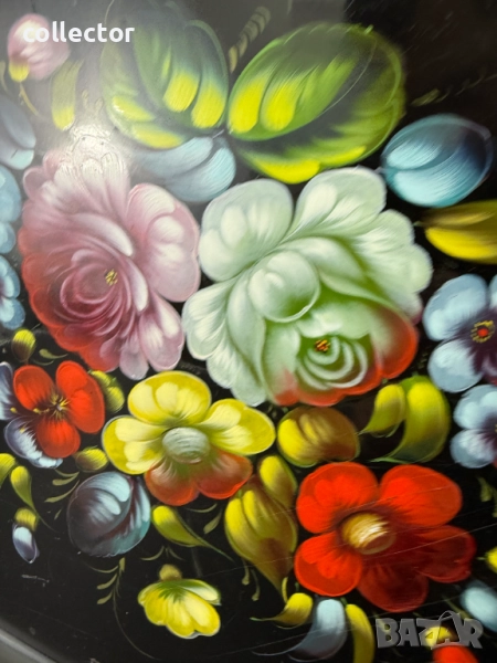 Съветска рисувана тава с флорални мотиви. Състояние видно от снимките, налични дребни драскотини.