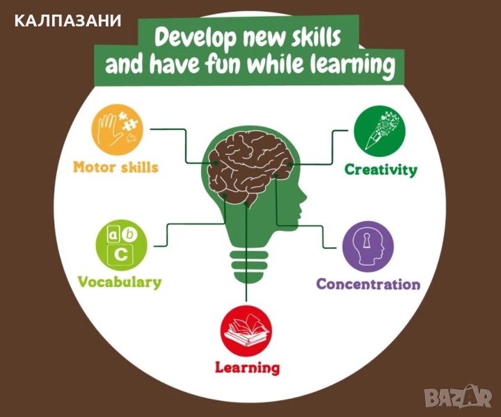 , наличен в кутията с играчките и в листовката. Онлайн образователната книга, достъпна на 7 различни езика (испански, португалски, английски, френски, немски, италиански, холандски).