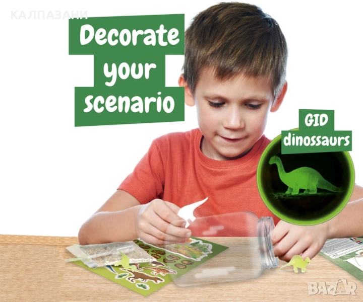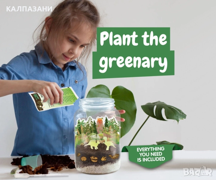 Фен ли си на динозаврите? Тогава ще харесате този комплект за игра: Терариум с динозаври! Украсете своя буркан, засадете растителността и създайте фантастична Джурасик гора! Добавете нотка магия към вашата екосистема, като поставите светещите в тъмното динозаври, включени в комплекта, във вашия терариум. Комплектът за терариум включва много стикери за Джурасик, позволяващи на децата да добавят магическа и забавна нотка към своята миниатюрна екосистема. Научете всичко за юрските местообитания и техните влечугоподобни обитатели с комплекта Терариум с динозаври! Този комплект е вдъхновен от методологията STEAM (преди известна като STEM играчка). STEAM означава наука, технологии, инженерство, изкуства и математика. Играчката включва онлайн образователна книга, достъпна чрез QR код или уебсайта