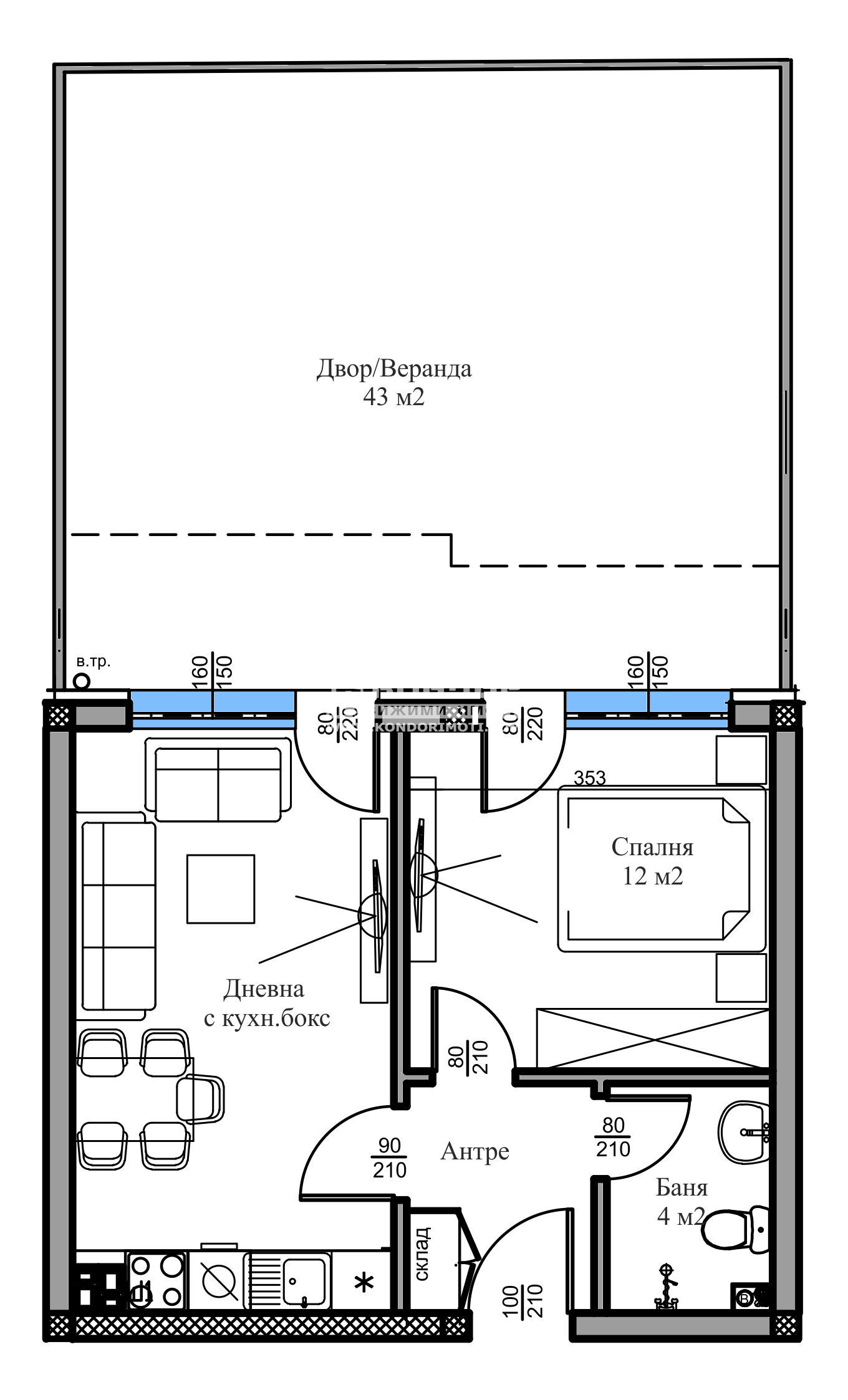 Оферта 68025: Представяме Ви двустаен апартамент в новоизграждаща се малка сграда, проектирана така, че да създаде максимален комфорт и уют в един от най-бързо развиващите се райони с лесен и удобен достъп и транспорт към Центъра на града. Жилището се състои от дневна с кухненски бокс, самостоятелна спалня, баня с тоалетна, склад, входно антре и дворна веранда с площ от 43кв.м. Сградата се намира на тихо и спокойно място в близост до всички необходими комуникации. Обектът се строи от фирма с доказан опит, като разполагаме с готови сгради и можем да Ви покажем качеството на изпълнение, което се осъществява с висококачествени материали и съвременни технологии, по европейски стандарт, петкамерна PVC дограма, червена Австрийска Тухла, масивна Блиндирана входна врата с 4-странно заключване, сензорно осветление, хидравлични асансьори с огледална кабина. Свободни паркоместа в двора на цена от 13 000евро!!! Възможност за Закупуване чрез Банков Кредит или разсрочено изплащане по време на строителството !!! Приложените снимките в Галерия са взети от други готови сгради на строителя, за да придобиете представа за нивото на което се издават жилищата. Възползвайте се от възможността да живеете в малка сграда на спокойно място !!!