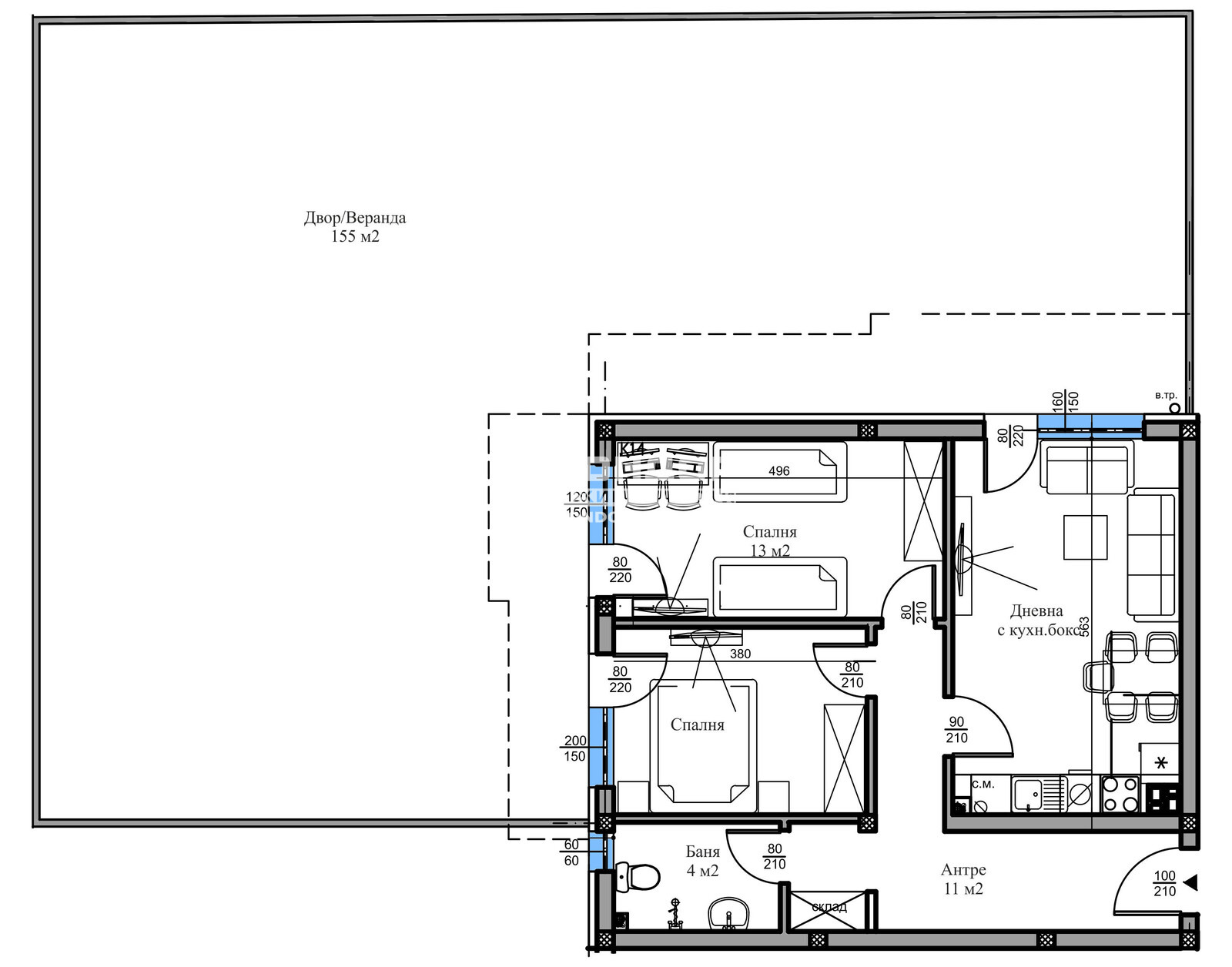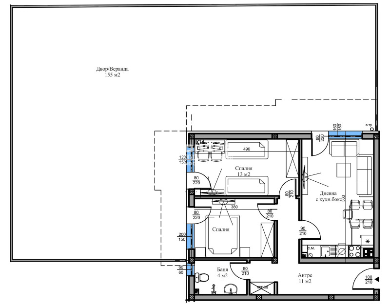 Оферта 68024: Представяме Ви тристаен апартамент в новоизграждаща се малка сграда, проектирана така, че да създаде максимален комфорт и уют в един от най-бързо развиващите се райони с лесен и удобен достъп и транспорт към Центъра на града. Жилището се състои от дневна с кухненски бокс, две самостоятелни спални, баня с тоалетна, склад и входно антре и дворна веранда 155 кв.м., която обхваща целия апартамент. Сградата се намира на тихо и спокойно място в близост до всички необходими комуникации. Обектът се строи от фирма с доказан опит, като разполагаме с готови сгради и можем да Ви покажем качеството на изпълнение, което се осъществява с висококачествени материали и съвременни технологии, по европейски стандарт, петкамерна PVC дограма, червена Австрийска Тухла, масивна Блиндирана входна врата с 4-странно заключване, сензорно осветление, хидравлични асансьори с огледална кабина. Свободни паркоместа в двора на цена от 13 000евро!!! Възможност за Закупуване чрез Банков Кредит или разсрочено изплащане по време на строителството !!! Приложените снимките в Галерия са взети от други готови сгради на строителя, за да придобиете представа за нивото на което се издават жилищата. Възползвайте се от възможността да живеете в малка сграда на спокойно място !!! ВИЖТЕ ОЩЕ ИЗГОДНИ ОФЕРТИ НА https://www.kondorimoti.com/ С ЕЖЕДНЕВНА АКТУАЛИЗАЦИЯ!