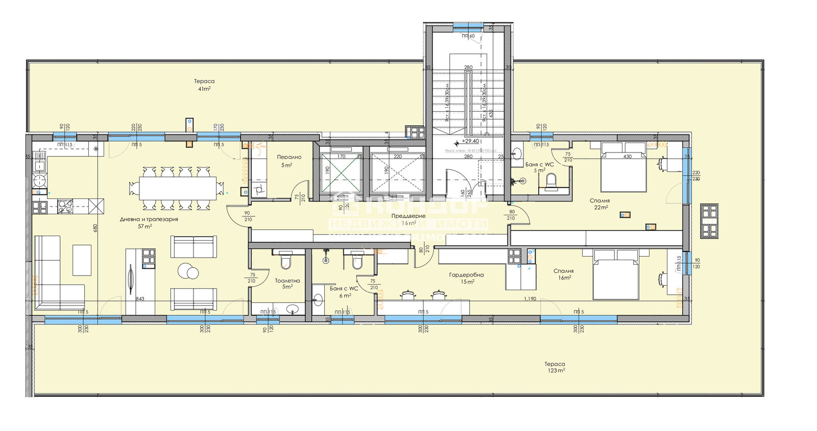 Оферта 62868: Предлагаме Ви възможността да закупите просторен 3-стаен апартамент тип пентхаус-самостоятелен на етаж с персонален достъп до асансьор директно в жилището в луксозна жилищна сграда с модерна визия, проектиран да създаде максимален комфорт на живущите в него. Основната концепция e премиум строителство, отличаващо се със съвременен архитектурен дизайн и европейска визия. Едно от основните му предимства е страхотната локация, разположен на пешеходна близост до Централна градска част, съчетаващо лукс спокойствие и комфорт. Жилището се състои от светла дневна с множество прозорци - 57кв.м. оформена на кътове: кът за мека мебел, кът за хранене с голяма трапезна маса и кухненска част с барплот, две големи спални: детска 22кв.м. със собствена баня и родителска с просторен дрешник 31кв.м. и голяма баня 6кв.м. към нея, отделна тоалетна обслужваща дневната и голям коридор с място за гардероб и перално помещение и две панорамни тераси. Към апартамента има прилежаща изба. Основната концепция при проектирането е да се постигнат просторни и функционални стаи с цел да се създаде максимален уют на модерното семейство. Изключителна съвременна архитектура и модерна технология на строителство. Визията е иновативна, привличаща внимание с уникалността си. Безопасна и сигурна среда за пребиваващите допълват комфорта на сградата. Всяко жилище разполага с пълно окабеляване за домофон, интернет и кабелна телевизия, общите части са луксозно завършени, а апартаментите са с алуминиева дограма с троен стъклопакет от най-висок клас, както и масивна блиндирана входна врата. За удобство на живущите съществува възможността да закупят подземни и надземни паркоместа. Възможност за закупуване чрез Банков Кредит на изключително изгодни условия за клиенти на Агенцията!ВИЖТЕ ОЩЕ ИЗГОДНИ ОФЕРТИ НА https://www.kondorimoti.com/ С ЕЖЕДНЕВНА АКТУАЛИЗАЦИЯ!