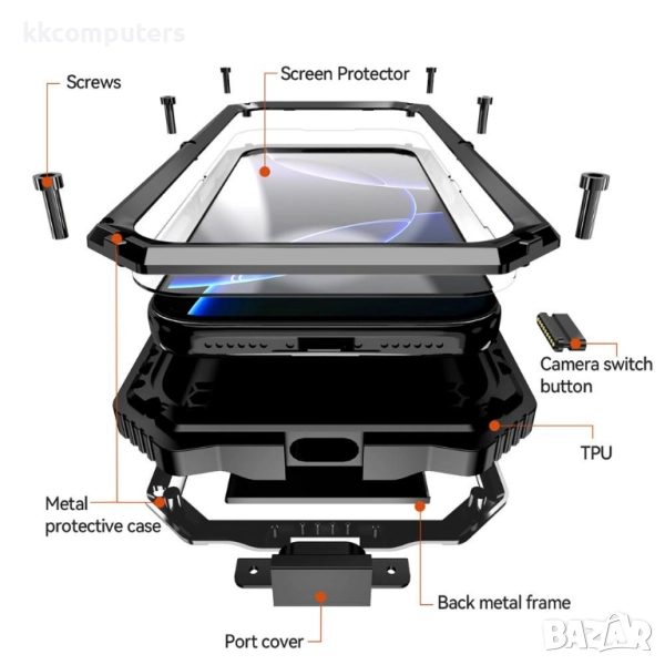 Всестранна защита: Комбинация от пластмаса (PC), силикон, стъклен протектор и метал гарантира отлична ударова защита и предпазва телефона от дребни надрасквания и прах.