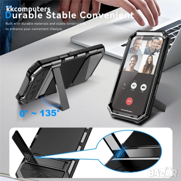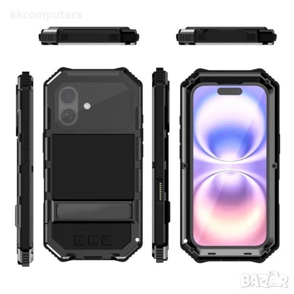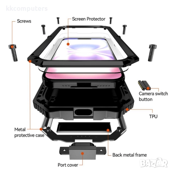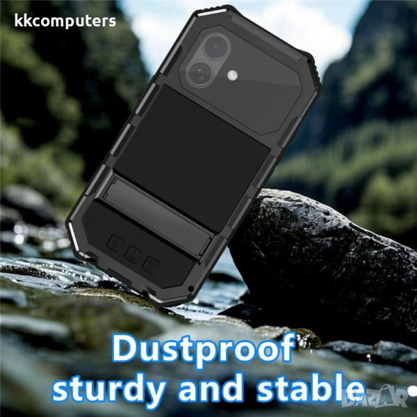 Всестранна защита: Комбинация от пластмаса (PC), силикон, стъклен протектор и метал гарантира отлична ударова защита и предпазва телефона от дребни надрасквания и прах.