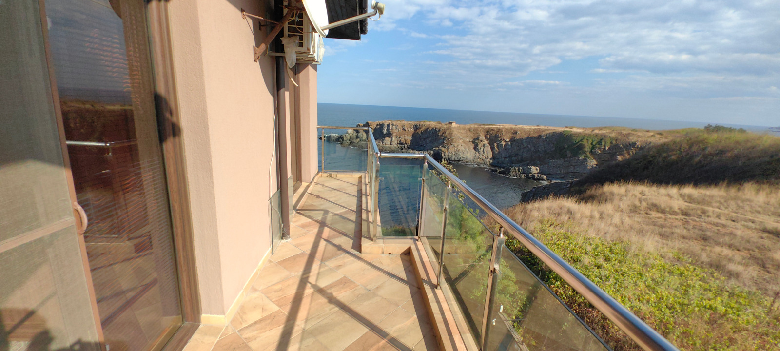 Апартаментът е разположен в новопостроена и въведена в експлоатация сграда с луксозни общи части, асансьор, два басейна, перфектно поддържан двор и денонощно видеонаблюдение. Зданието е с отлична локация, разположено е на самия морски бряг и е на метри от плаж 'Бутамята'. Освен с местоположението си, сградата впечатлява и с уникалната си фасада. Качеството на строителството е високо - стоманенобетонна конструкция с тухлена зидария, топло- и хидроизолация, общите части са напълно завършени по БДС - с качествен гранит, мазилки и парапети. Сградата разполага с панорамен асансьор, чрез който може да се осъществи достъпа до имота. Апартаментът е разположен на 3-ти жилищен етаж на сградата, с фронтален изглед към морето е и е с площ от 86 кв.м. Разпределението му е функционално, апартаментът е изключително удобен и просторен и гарантира неповторими морски гледки. Свободната площ в имота е с озеленяване и кътове за отдих и е предназначена изключително за ползване от собствениците на апартаменти и техните гости. При продажбата на имота се прехвърля и идеална част от парцела, върху който е построена сградата. Годишната такса поддръжка за апартамента е в размер на 370 евро за целия имот.