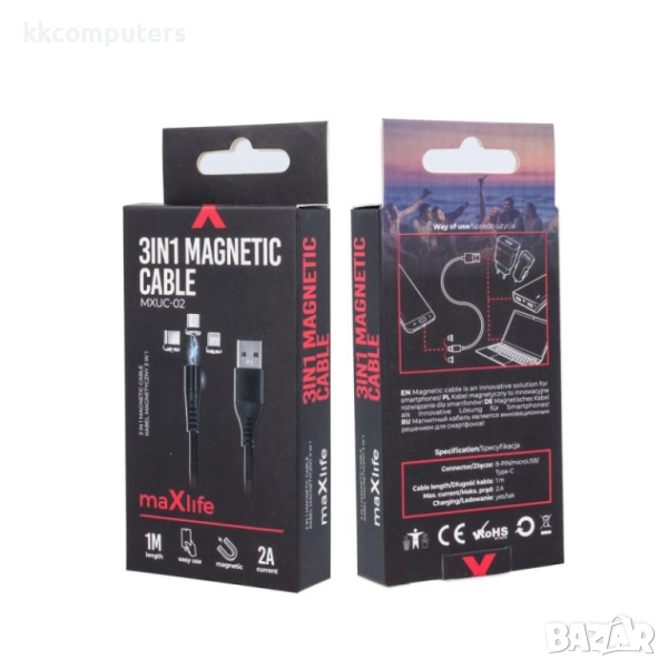 Кабел USB - Lightning + USB-C + Micro USB, Maxlife MXUC-02 1м магнитен, 2A, Черен