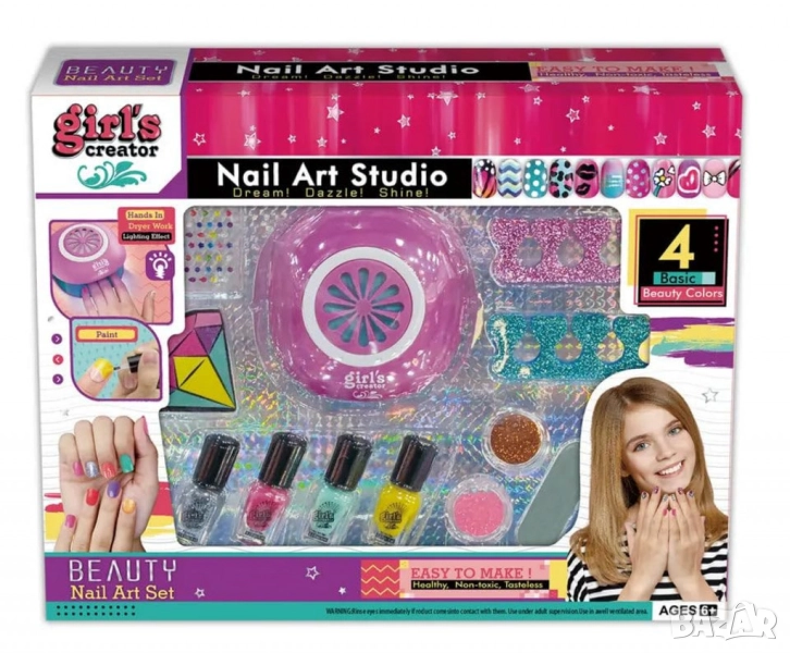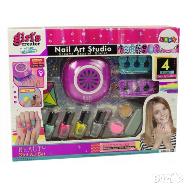 Комплектът включва: сушилня за нокти, 4 цвята лак за нокти: зелен, розов, жълт, сребрист, лепенки за пръсти, пила за нокти, стикери за нокти;