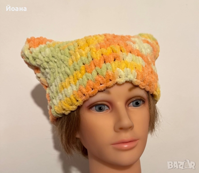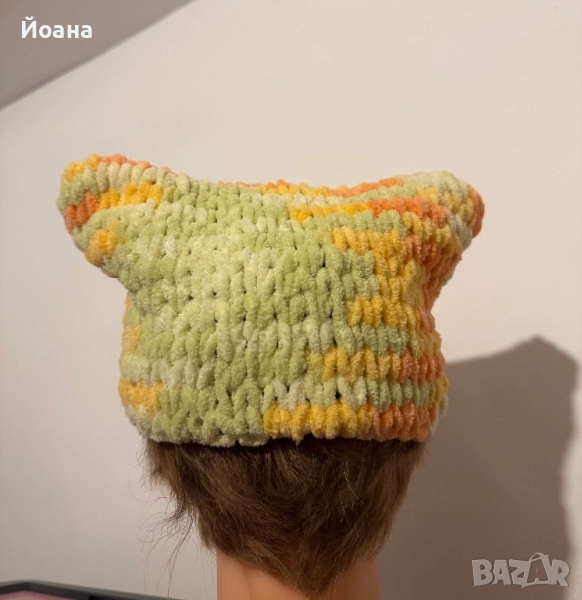 Ръчно плетена шапка от прежда с форма на котешки уши → Обява 52055532