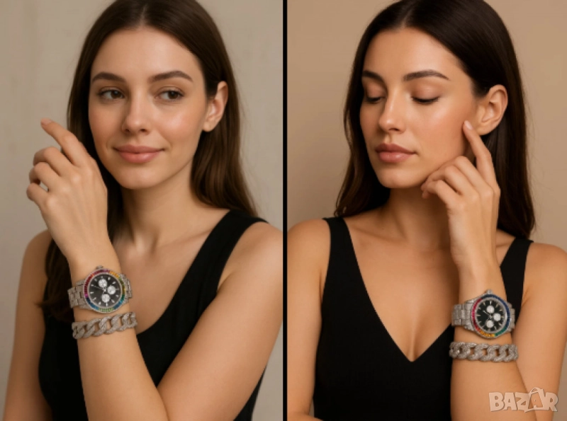 Сребриста основа, бели и цветни камъни по цялата дължина на часовника и гривната. Цветен безел, черен циферблат и стилен контраст за елегантна, но смела визия.