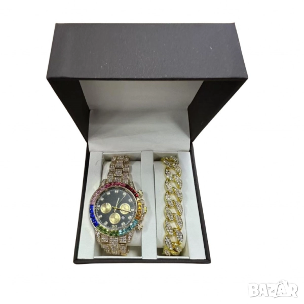 Богато златно покритие, блестящи инкрустации по цялата верижка и корпус. Безел с цветна дъга от кристали, черен циферблат със златни стрелки. Гривна в златен цвят с богато обсипани камъни за завършена визия.