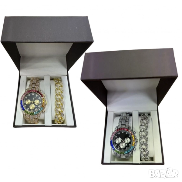 Потопете се в света на блясъка и индивидуалния стил с този ексклузивен комплект, включващ луксозен часовник и масивна гривна тип „Cuban“. Предлага се в два впечатляващи варианта – златен и сребърен – всеки със своя уникален характер и визия.
