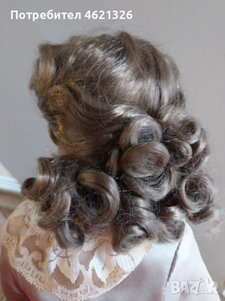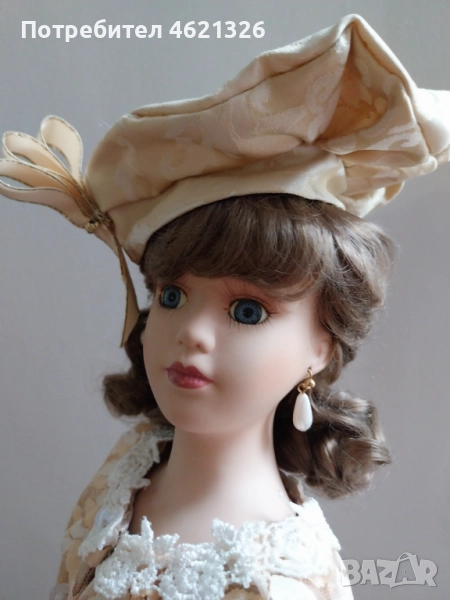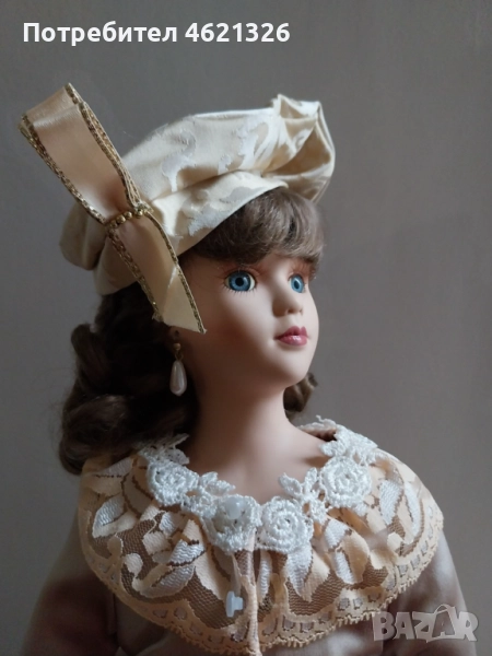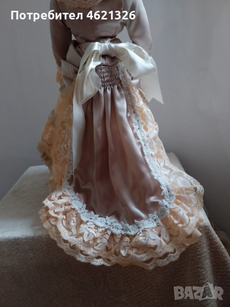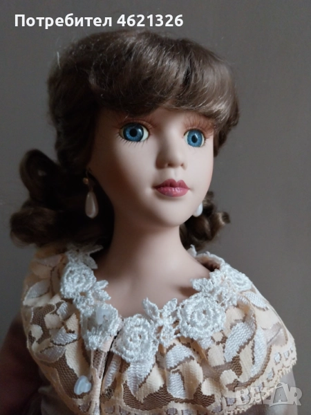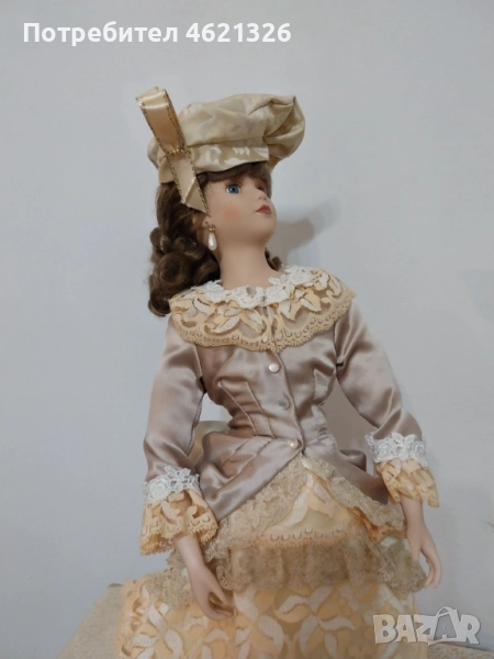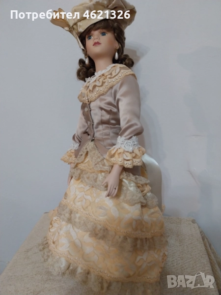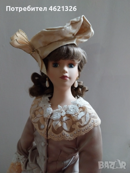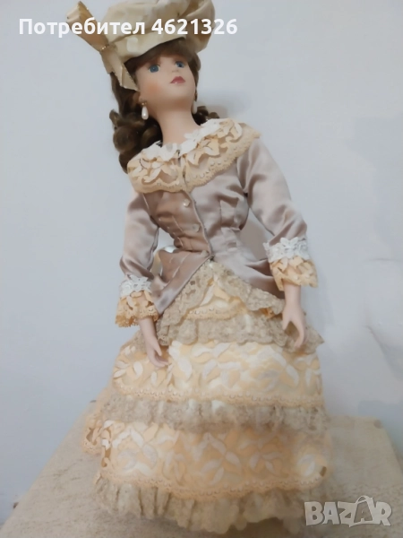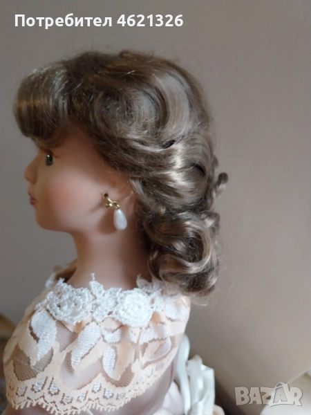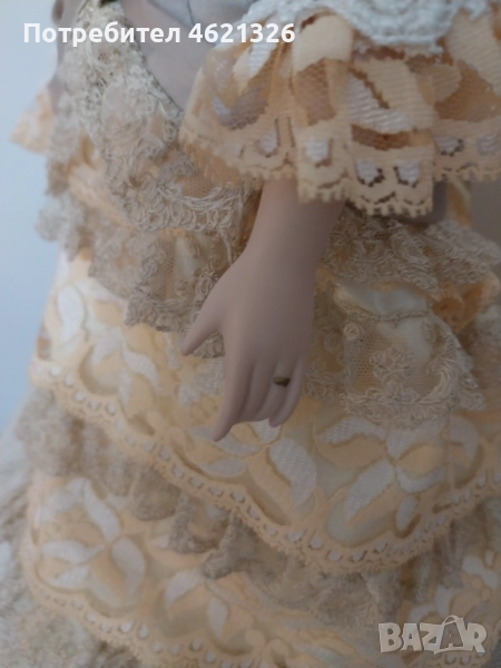 Представям ви зашеметяваща, красива порцеланова кукла, в перфектно, чисто състояние. Облечена е в рокля в пастелни тонове, богато украсена пола с дантела. Отзад има разкошен шлейф. Характерен е детайла от перлени обици и седефени копчета, обемна барета с пандела. На лявата ръка има халка (показана е на снимка). Неизвестен е автора и периода на създаване. Висока е 48см.
