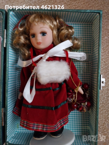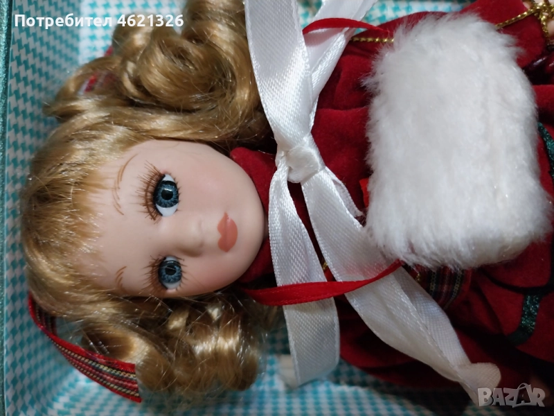 Преставям ви малка порцеланова кукла Виктория от фин порцелан. Поставена е в кутия, с 2 тоалета-червена и розова рокля,с черни ботуши и бели обувки. Към червената рокля има коледен венец и маншон. Сините очи и руси къдрици предават изключителна мекота на изражението. Тъмно зелената кутия събира куклата и всичките аксесоари. Това превръща целия артикул в прекрасен подарък.