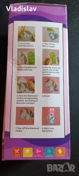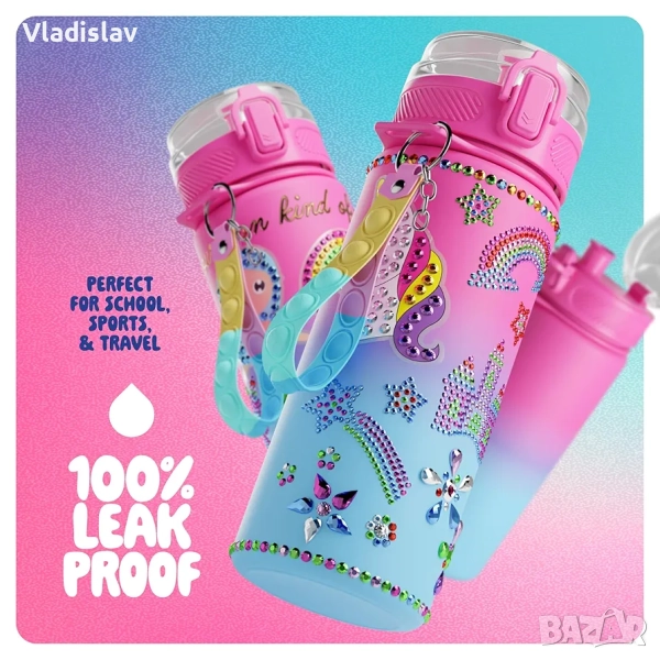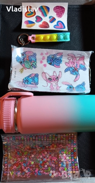 Термос/Бутилка за вода за деца със Стич , с персонализирани аксесоари, СТИЧ,кристали и стикери, 6-9 години, розов/син, 600 ml