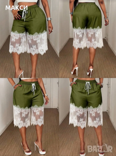 Макси модерен ефирен къс пола-панталон с висока ластична талия + кор.вързалки в светло синьо и маслено зелено + красив широк кант бяла дантела