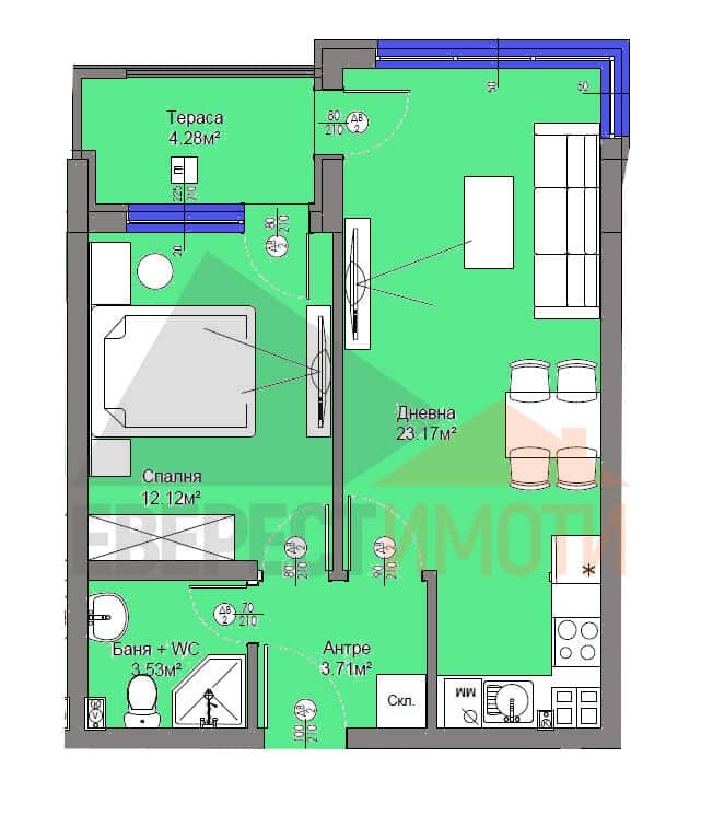 Оферта 4321: ДИРЕКТНО ОТ ИНВЕСТИТОР, БЕЗ КОМИСИОН!! ЛУКСОР 7 представлява една модерна сграда, проектирана с прави форми и много малък процент общи части, разположена в много тих и зелен район, обединяващ спокойствие, сигурност, функционалност, лукс и чудесно местоположение. Всичко това на едно място, на изгодни цени!!! Предлагаме Ви ДВУСТАЕН АПАРТАМЕНТ с възможност за закупуване на ПАРКОМЯСТО във вътрешен двор или ГАРАЖ. СГРАДАТА е с красива архитектура на прекрасно място, с визия прилягаща за квартала. Апартаментът се състои от просторна дневна с трапезария и кухненски бокс, една хубава спалня, баня с тоалетна, входно антре, склад и тераса. Строителството е прецизно с много високо качество на изпълнение и материали: керамична тухла, немска 5-камерна дограма от най-висок клас с мултифункционално стъкло, дизайнерско стълбище/виж галерия/ от естествен камък и облицовка на фасадата, 10 см. външна топлоизолация, парапети на стълбището и терасите от ковано желязо и алуминий, блиндирани входни врати, безшумен асансьор, домофонна система с видеонаблюдение, декоративни елементи по фасадата, LED осветление по общи части и фасада и много други екстри за живущите. Жилищата се издават на шпакловка и замазка с изградена ел. инсталация с ДТЗ, контакти и ключове, ВиК на тапа, входна блиндирана врата от най-висок клас. Мястото е тихо и много спокойно. ЧУДЕСЕН за инвестиция и живене поради бързата си връзка към централните райони и достъпа си до големи университети. Разсрочено плащане в рамките на строителството. Агенция ЕВЕРЕСТ ИМОТИ съдейства за закупуването чрез банков кредит от водещи банки на преференциални условия за клиентите си!!