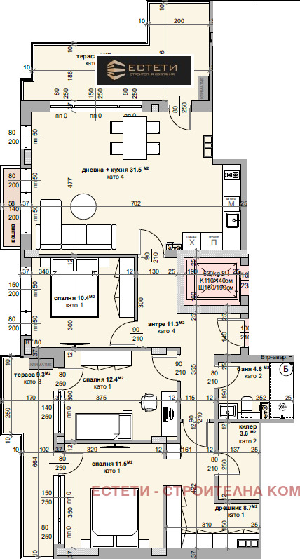 🏡 Пентхаус състоящ се от: антре, дневна с кухня, 3 спални, баня с тоалетна, килер, дрешник,просторни тераси. Квадратура - 153 кв.м.