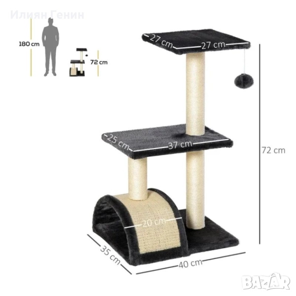 Детайли за продукта - кула за котки: Общ размер: 40Д x 35Ш x 72В см; размер на подложката за пълзене: 35Д x 20Ш x 13В см. Подходяща за котки под 4,5 кг. Необходим е монтаж.