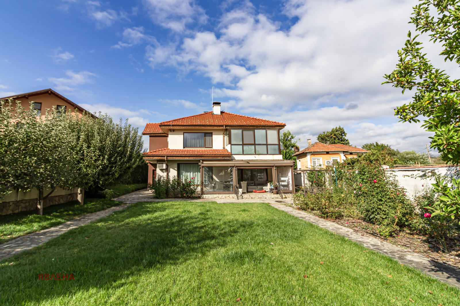 Зад масивна и висока ограда се разкрива частен вътрешен свят два надземни гаража с допълнителни паркоместа и прецизно поддържан двор от 1060 кв.м. Пространството е оформено с вертикална планировка: равна поляна с райграс, декоративна растителност и плодни дръвчета, носещи усещане за уют и завършеност.