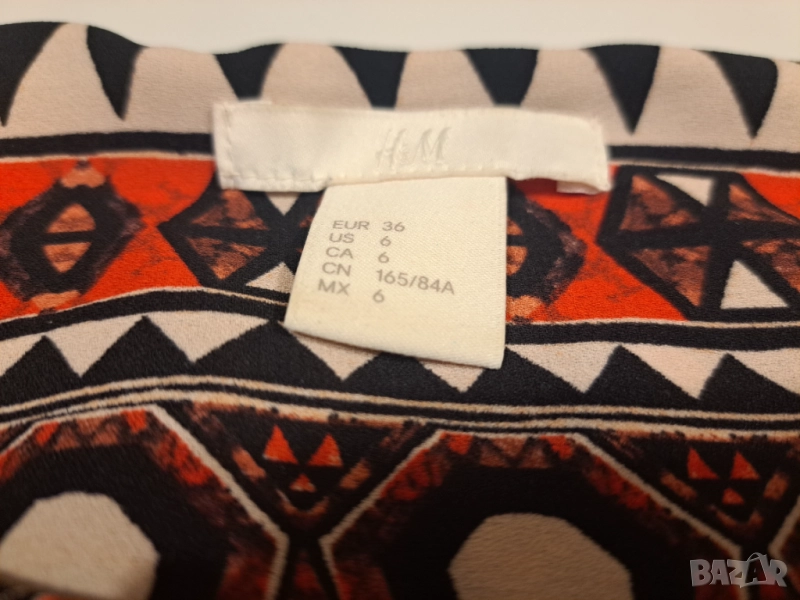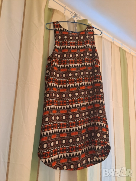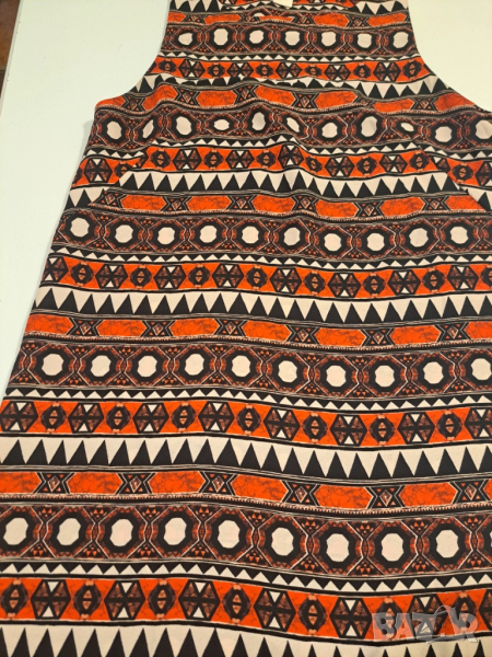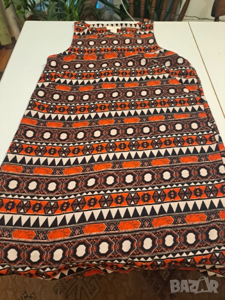 Оригинална рокля H&M без ръкави, с ярък геометричен десен в оранжево, черно, бяло и червено. Материята е лека и удобна, подходяща за пролет и лято. Размер: EUR 36 / US 6 / CA 6 / CN 165/84A / MX 6.