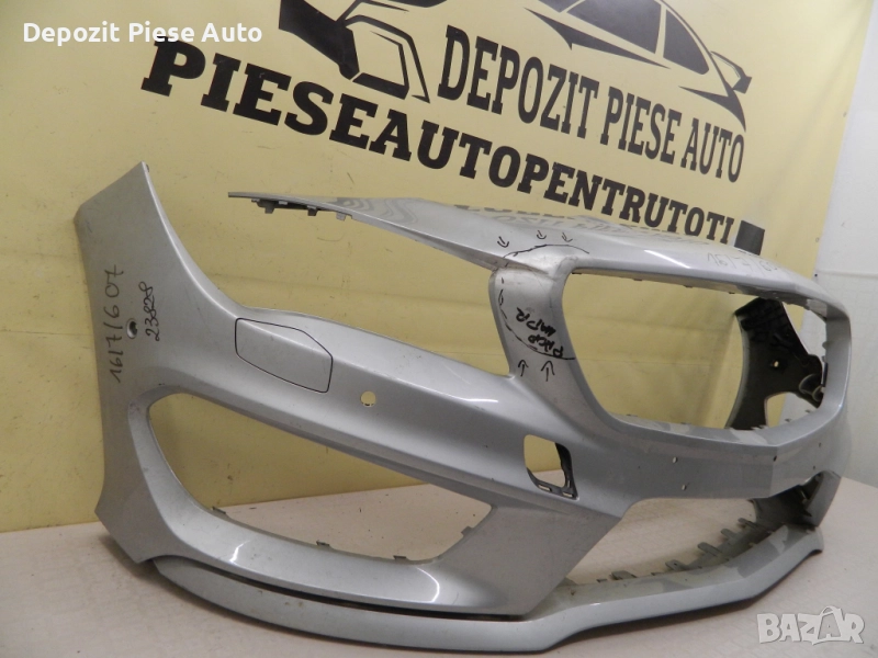 23828 Предна броня Mercedes CLA W117 AMG, 2013, 2014, 2015, 2016, оригинален код A1178850825. С отвори за парктроници (6) и мигачи за фарове, ремонтирана отдясно до фар.