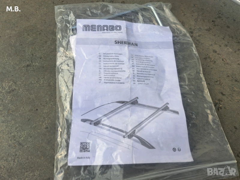 Продавам ориг. алуминиеви напречни греди на италианската марка Menabo Sherman за монтаж в/у релинг; макс. разстояние м/у надлъжните греди (релинга) 110 см