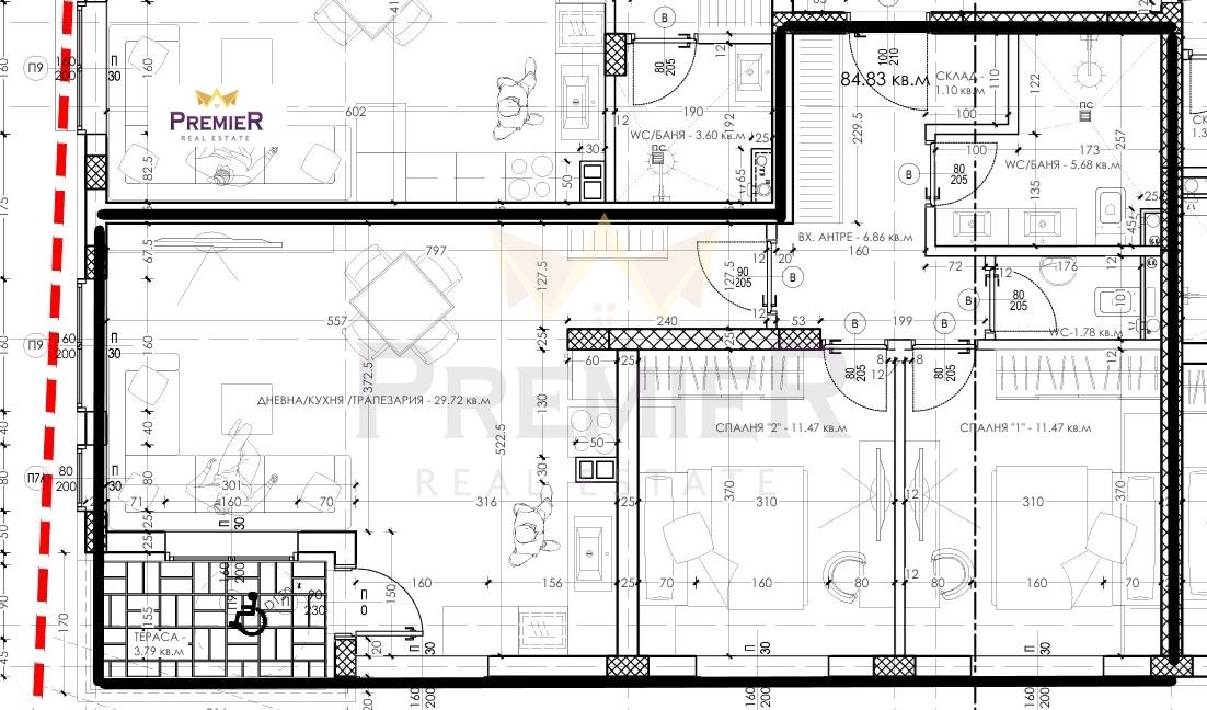 Апартаментът е с площ 99кв.м и се състои от: входно антре, просторен дневен тракт 30кв.м, две спални по 12кв.м, обща баня с тоалетна, втора отделна тоалетна, килер, тераса. Разпределението на имота го прави удобно и функционално семейно жилище три сервизни помещения и просторни стаи. Изложението на стаите е югозападно, коеот осигурява максимална осветеност и топлина в имота.