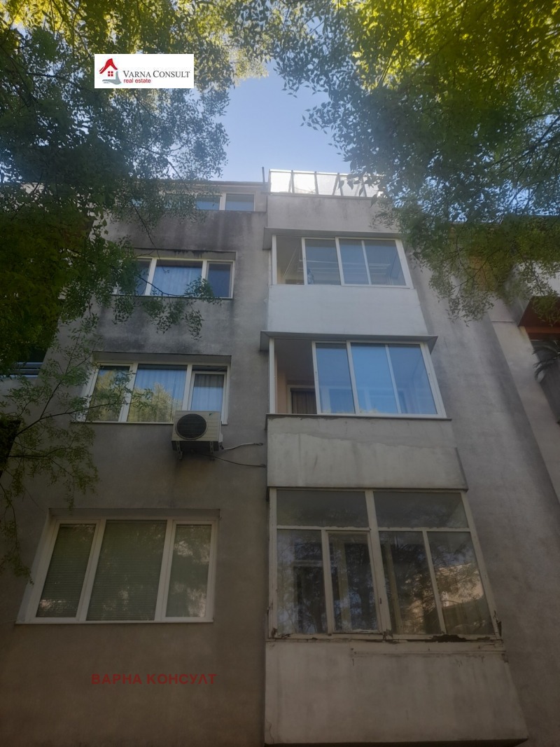 ;Варна Консулт'продава в град Варна двустаен апартамент от 75кв.м., в тухлена сграда от 1982година, на трети етаж. Състои се от: входно антре, кухня с трапезария, голяма спалня. Към двете помещения има обща тераса, баня и тоалет отделно с общо предверие към тях обесобено, като помощно и перално, обзаведено таванско помещение от 21кв.м. с баня и тоалет, което се отдава под наем и изба 15кв.м. Жилището е много топло и слънчево. В близост се намира Централна поща,Градска болница, Катедралата,множество магазини, главни пътни артерии и спирки на градски транспорт.