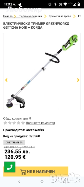 Използван един път.Електрическа тример за тел Greenworks 230V, електрически мотор 40 см ширина на рязане 2 мм тел, полу-земна ударна глава - автоматична GST1246.ЛЕСНО СТАРТИРАНЕ - Включете и стартирайте: С електрическия тример с мощност 1200 W, започнете веднага да косите тревата си свободно, без да се притеснявате за бензинови или маслени филтри