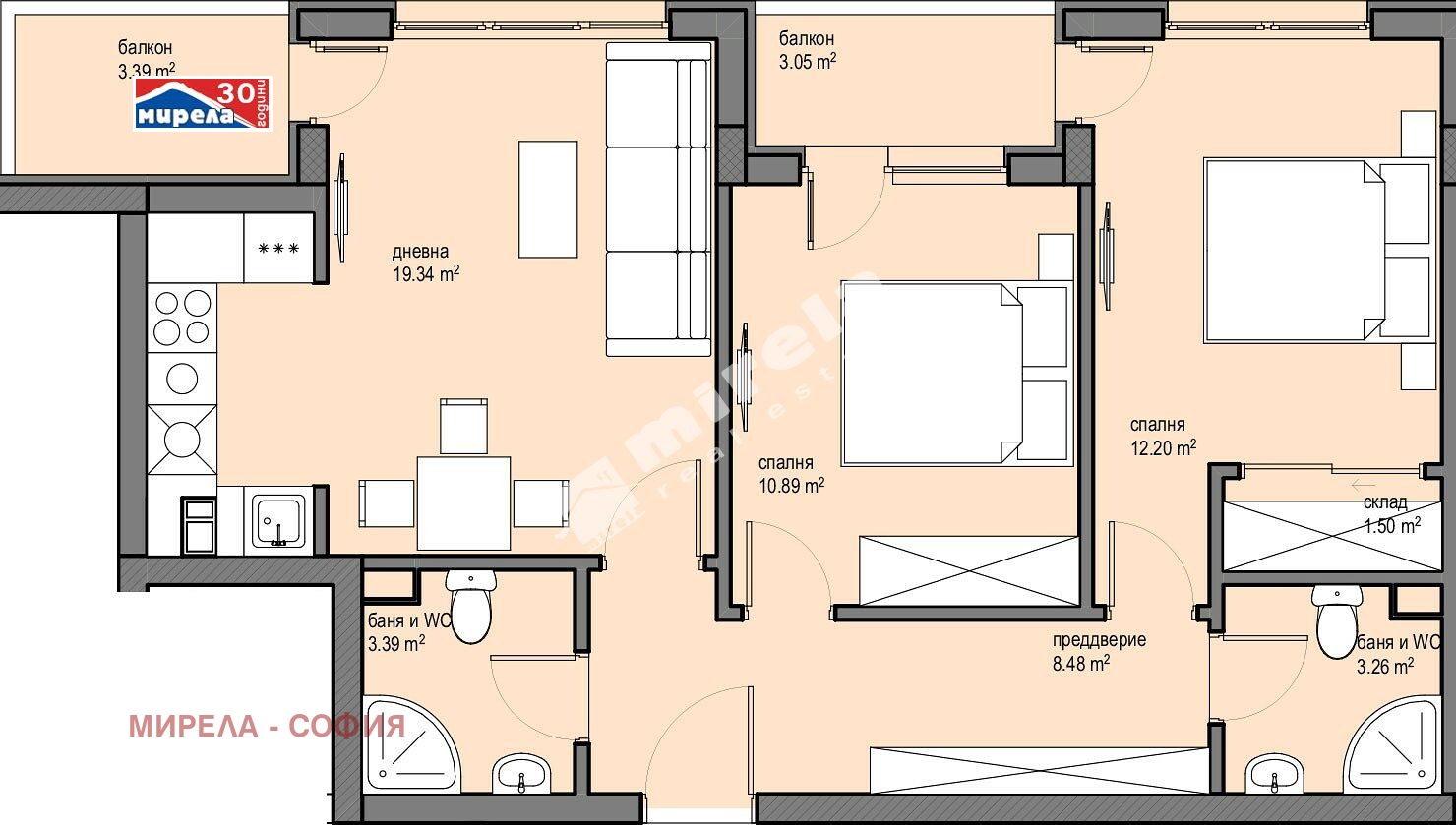 Разпределение: антре, хол с кухненски бокс и трапезария с излаз към балкон, две спални, две бани с тоалетна и балкон.